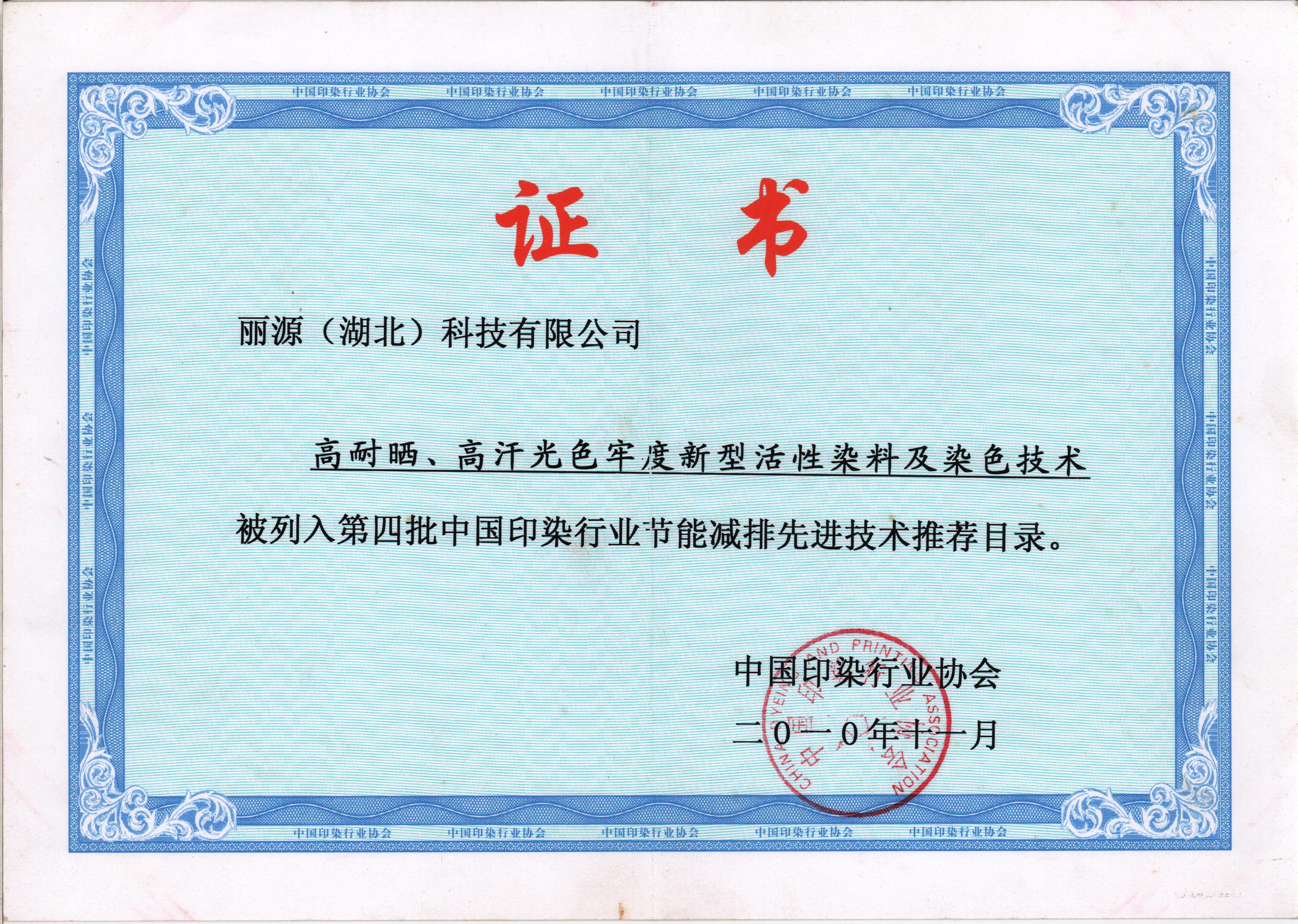 2010年11月,麗源科技高耐曬高汗光色牢度新型活性染料及染色技術(shù)被中國印染行業(yè)協(xié)會列入第四批「中國印染行業(yè)節(jié)能減排先進(jìn)技術(shù)推薦目錄」